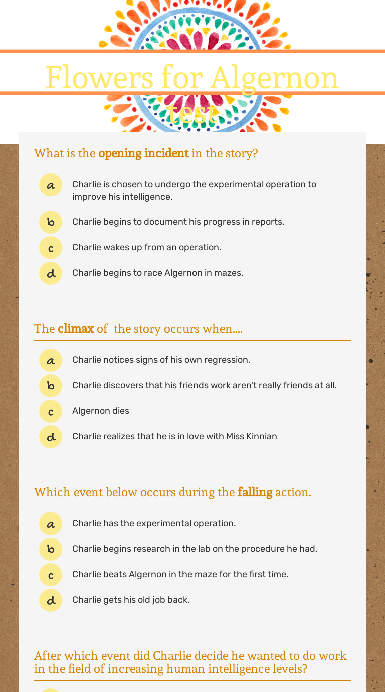 We finished reading "flowers for algernon." let's review! Learn everything you need to know about teaching flowers for algernon,. (last modified on july 26, 2016). Discuss the following questions with students to guide deeper understanding of the main themes of the story: The story is told by a series of progress reports written by charlie gordon, the first human subject for the surgery, and it touches on ethical and moral themes .